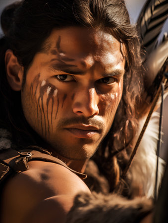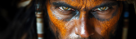 Closeup of a tribal man with intricate face paint and traditional headdress, intense gaze