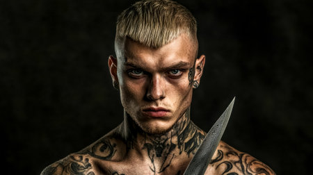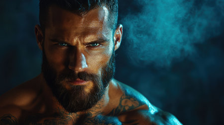 A muscular man with a well-defined beard and tattoos stares intensely at the viewer. The dramatic lighting highlights his chiseled features while wisps of smoke create a mysterious atmosphere around him.