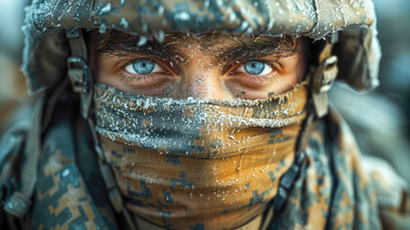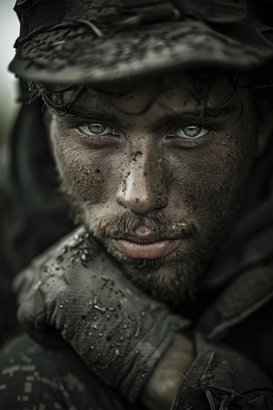 Intense close up of battle weary soldier showcasing profound fatigue and extreme exhaustion