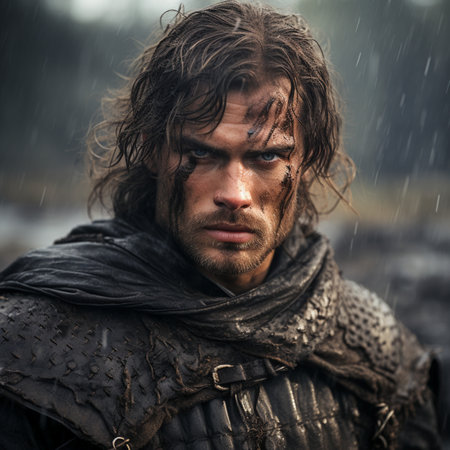 An AI generated illustration of A middle-aged warrior man with a tired expression is standing in a shower of water droplets