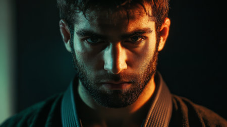 Intense Gaze Portrait of a Young Man with Curly Hair and Beard in Dramatic Lighting.