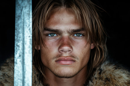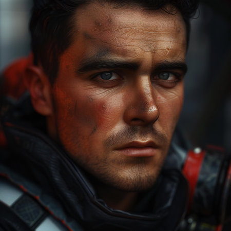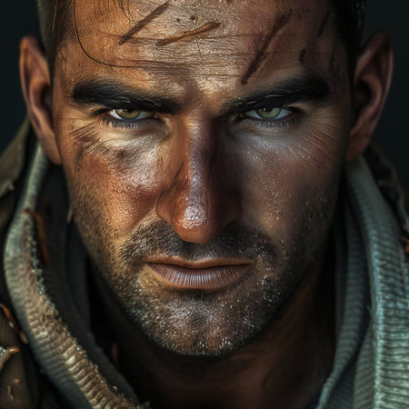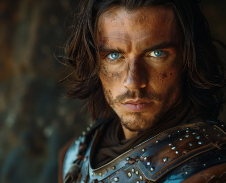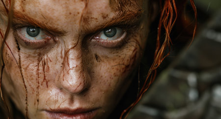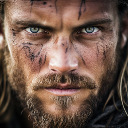 Battle-worn warrior gazes intensely with striking blue eyes.