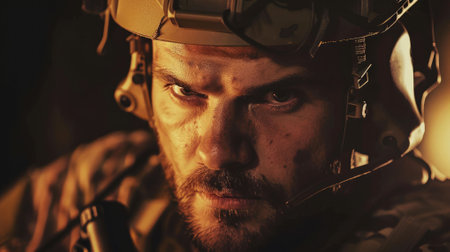 The close up picture of the military officer is working on the operation in the warfare or battlefield, the military require skill like endurance, training, physical strength and combat skill. AIG43.