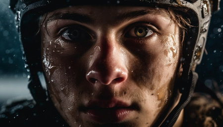 A man with a black helmet and a black face with dirt on it. The man's face is covered in dirt and sweat, and he has a serious expression on his face