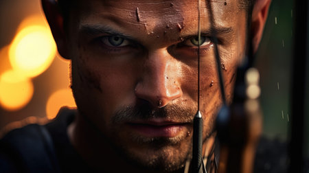 archer in the middle of a precise shot, concentration in their eyes generative ai