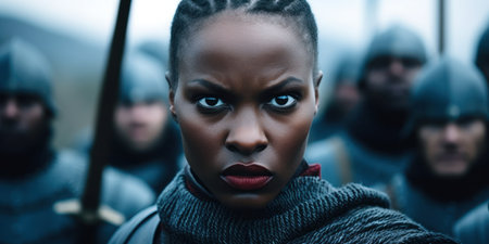 Fierce medieval warrior with battle-worn armor and bloodied face