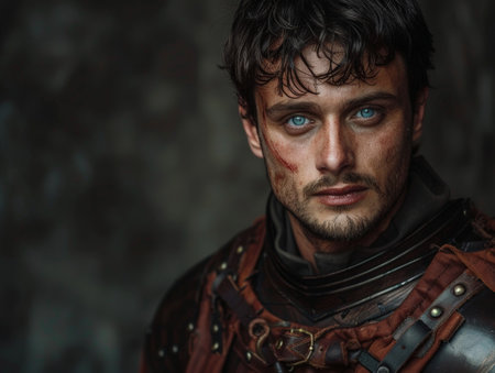 Portrait of medieval warrior knight in armor with bloody face and scar.