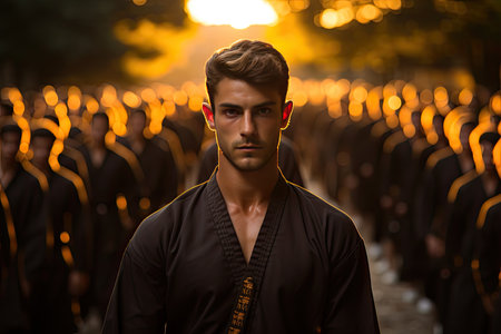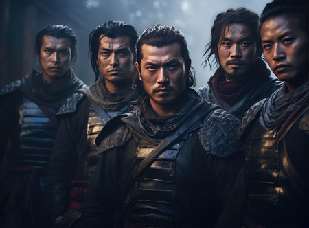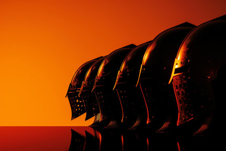 Warriors in armor stand ready at sunset, highlighting strength and valor in a historic battle formation