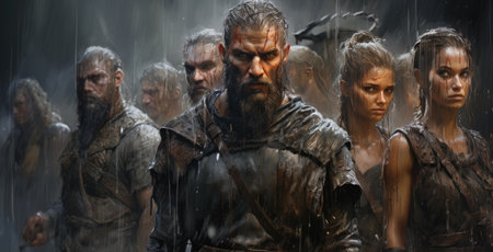 Warriors in medieval armor and war paint resting after an intense battle, reflecting drama and heroism in a misty battlefield.