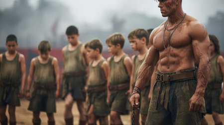 fierce Spartan training ground: young warriors undergo rigorous physical mental exercises elders watch