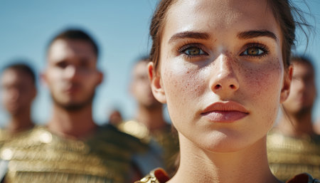 Roman soldiers in battle armor, preparing for combat in ancient Rome. The leader stands in focus, ready for action.