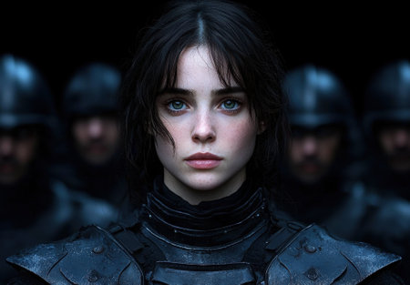A ready battle soldier gazes intensely, surrounded by fellow warriors in armor.