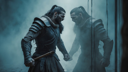 Warrior confronts reflection in misty environment during intense moment of battle preparation