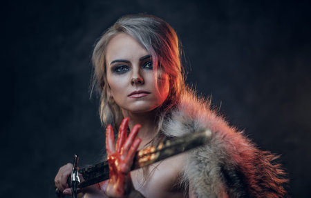 Portrait of a beautiful naked woman with blood stained skin holding a long sword and posing for a camera, wearing only fur. Fantasy fashion. Studio photography on a dark background. Cosplayer as Ciri from The Witcher.