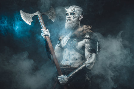 Northern vandal seafarer with muscular build holding huge axe and staring at camera in dark smokey background.