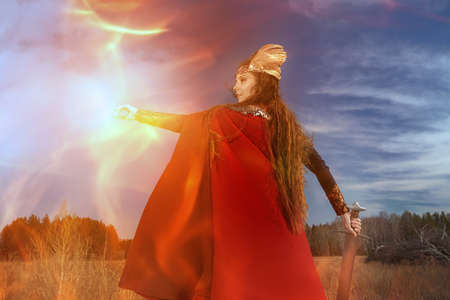 Beautiful girl warrior with sword in the field. Medieval warrior.