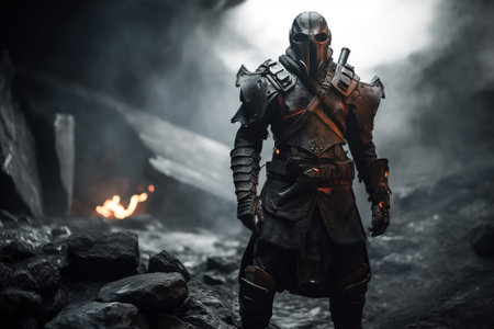 Warrior in helmet and leather armor outdoors, post apocalypse. Dark fantasy illustration Generative AI.