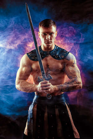 Portrait of handsome muscular gladiator with sword. Isolated. Studio shot.