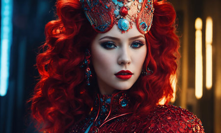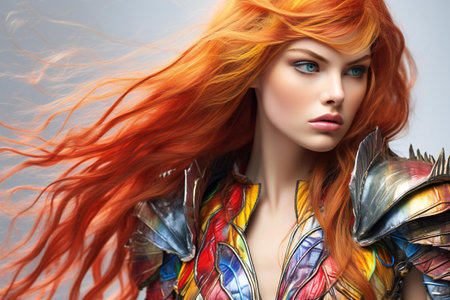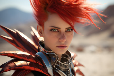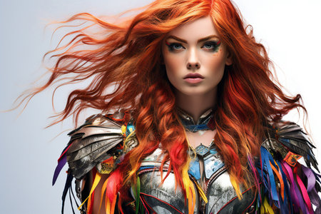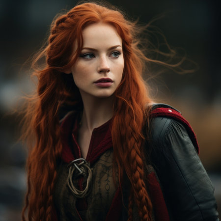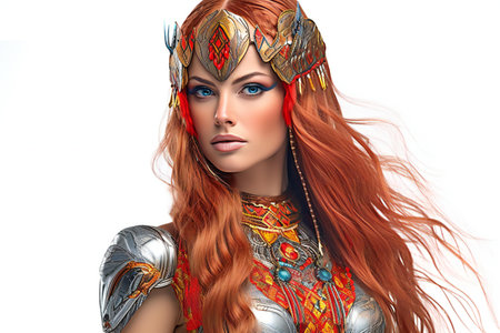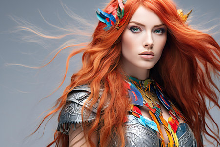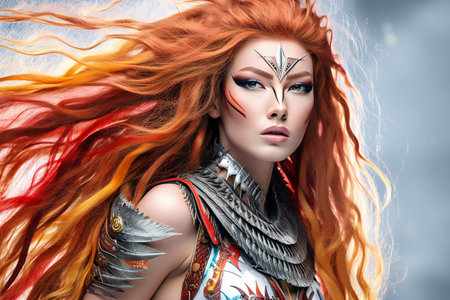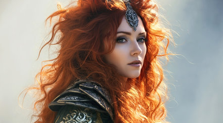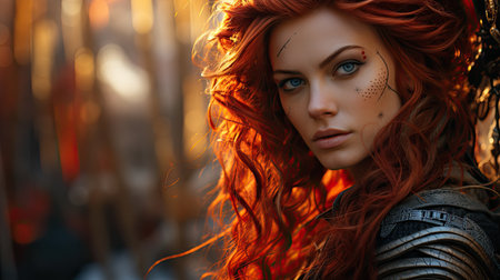 A striking portrait of a fierce woman with flowing red hair and intricate accessories, capturing a moment of strength and beauty. Generated A.I.