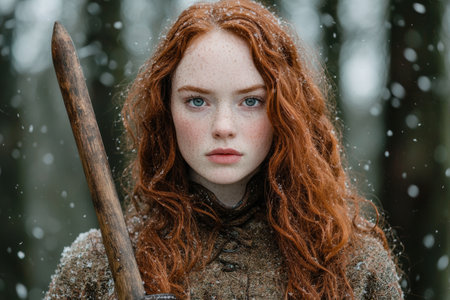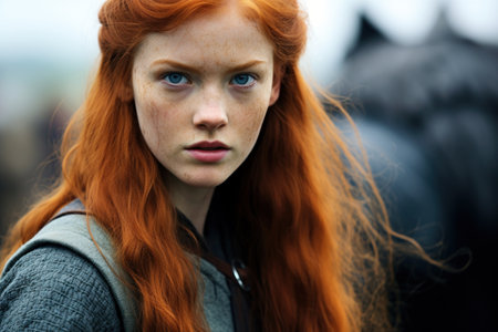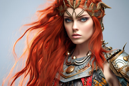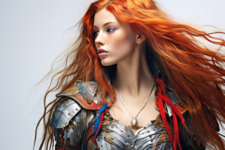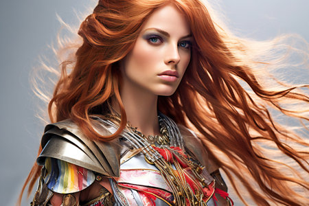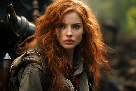 Warrior amazon woman. Portrait of beautiful redhead girl.