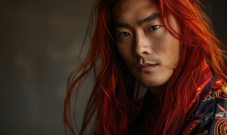 Portrait of young Asian man with deep red long hair in traditional clothes looking at camera