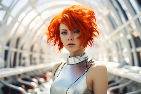 Futuristic woman with red hair in futuristic costume. ai generative.