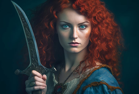 Beautiful red-haired woman with a sword in her hands.
