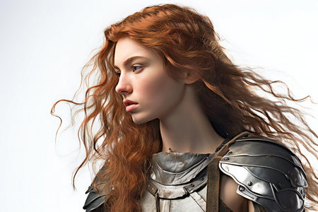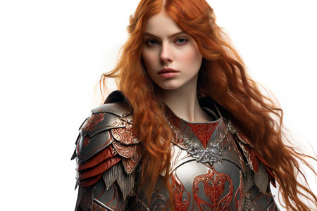 Portrait of a beautiful red-haired girl in armor on a white background