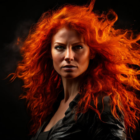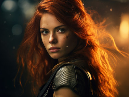 Fiery red-haired woman with intense gaze and dynamic lighting