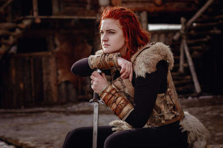 Viking girl with red hair. In the hands of the sword to fight the enemy. Reconstruction of a medieval scene. Against the backdrop of a large viking village.