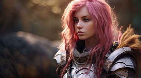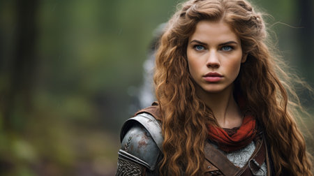 Portrait of a beautiful young woman with long hair wearing medieval armor