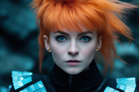 Striking portrait of a young woman with vibrant red hair and piercing blue eyes