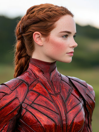 Redheaded woman with braided hairstyle wearing a vibrant red and black armored costume