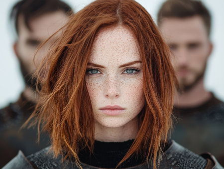Redheaded woman with freckles and intense gaze