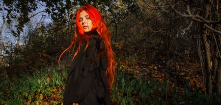 Portrait of a beautiful red-haired girl in a dark forest