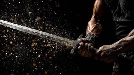 A muscular warrior holds a sword tightly as dust and particles scatter around him, evoking a sense of power and focus in a dimly lit environment.