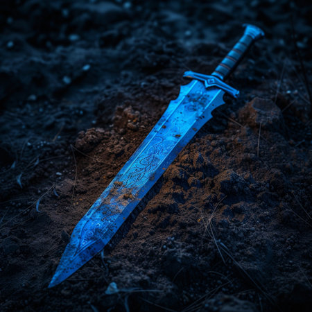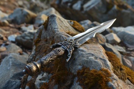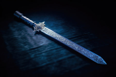 Ornate medieval fantasy sword lying on a dark stone surface, evoking themes of history, battles, and ancient legends