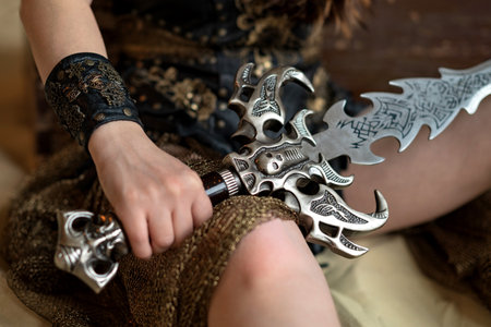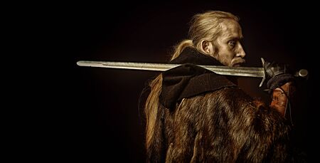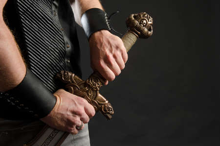 Cosplay character. Strong warrior with a sword in his hands. An angry hero, ready to attack