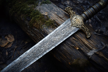 Ornate medieval sword lying on a weathered log, evoking a sense of history, fantasy, and adventure