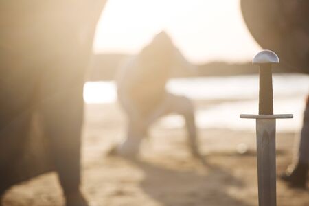 Sword at buttlefield and defeated warriors, reencators with wearpons at seaside