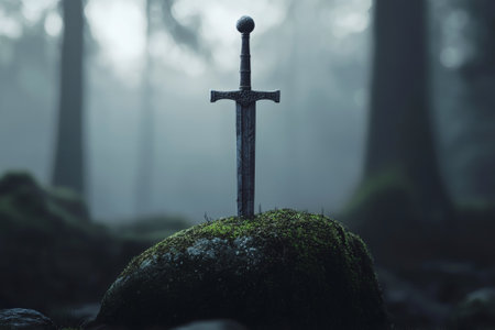A stunning visual of a lone sword embedded in the ground, shrouded in fog, evoking themes of history, bravery, and the mysterious tales of past battles. Ideal for storytelling and exploration.