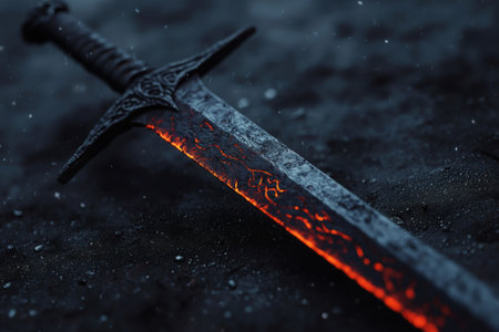 A fierce sword lays on a dark surface, radiating a warm orange glow from within its intricately designed blade. The atmosphere is filled with mystery, hinting at a fierce battle.