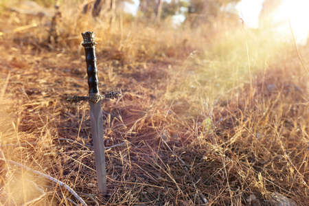 mysterious and magical photo of silver sword over England woods or field landscape with light flare. Medieval period concept.