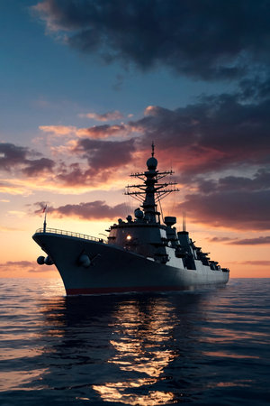 A modern naval destroyer is depicted sailing on a calm ocean during a dramatic sunset. The sky is filled with vibrant orange, pink, and yellow clouds, reflecting on the water's surface. The warship, with its imposing structure and weaponry, is positioned in the foreground, cutting through the gentle waves. The reflection of the ship and the colorful sky creates a striking visual. The scene evokes a sense of power, majesty, and the vastness of the sea.