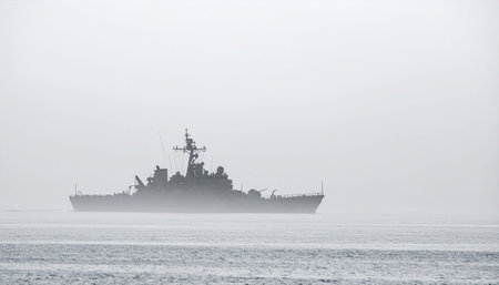 A powerful naval warship glides silently through a thick blanket of ocean fog. Its imposing silhouette is barely visible, creating a sense of mystery, tension, and stealthy power as it navigates the calm but ominous waters on a covert mission.