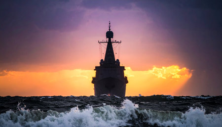 A modern naval warship cuts through rough seas, its powerful silhouette stark against a dramatic and fiery sunset. The vessel is on a solitary patrol, a symbol of strength and vigilance in the vast, open ocean.