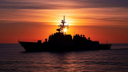 The dark silhouette of a modern naval warship is captured against a dramatic sunset over the ocean. The sky is ablaze with vibrant hues of orange, red, and yellow, casting a warm glow on the horizon. The ship, with its intricate superstructure and antennas, is clearly defined against the colorful backdrop. The calm sea reflects the fiery sky, creating a powerful and scene.