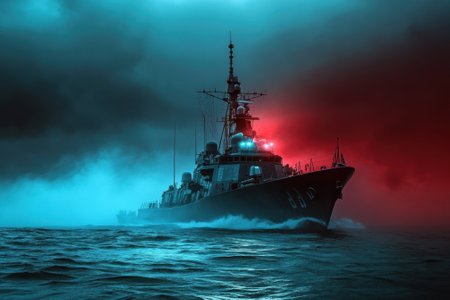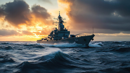 A dramatic shot of a large military ship patrolling the ocean, with a powerful silhouette against a stormy sky and turbulent waves creating a sense of motion.