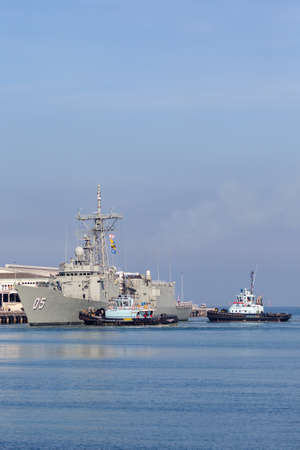 Melbourne, Australia - June 12, 2015: HMAS Melbourne (FFG 05) Adelaide-class guided-missile frigate of the Royal Australian Navy docking at Station Pier in Melbourne with the assistance of tug boats.