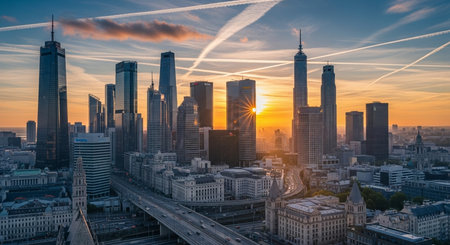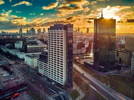 Beautiful panoramic aerial drone view to the ?enter of modern Warsaw city with silhouettes of skyscrapers in in the rays of the setting winter January sun - amazing sunset, Poland